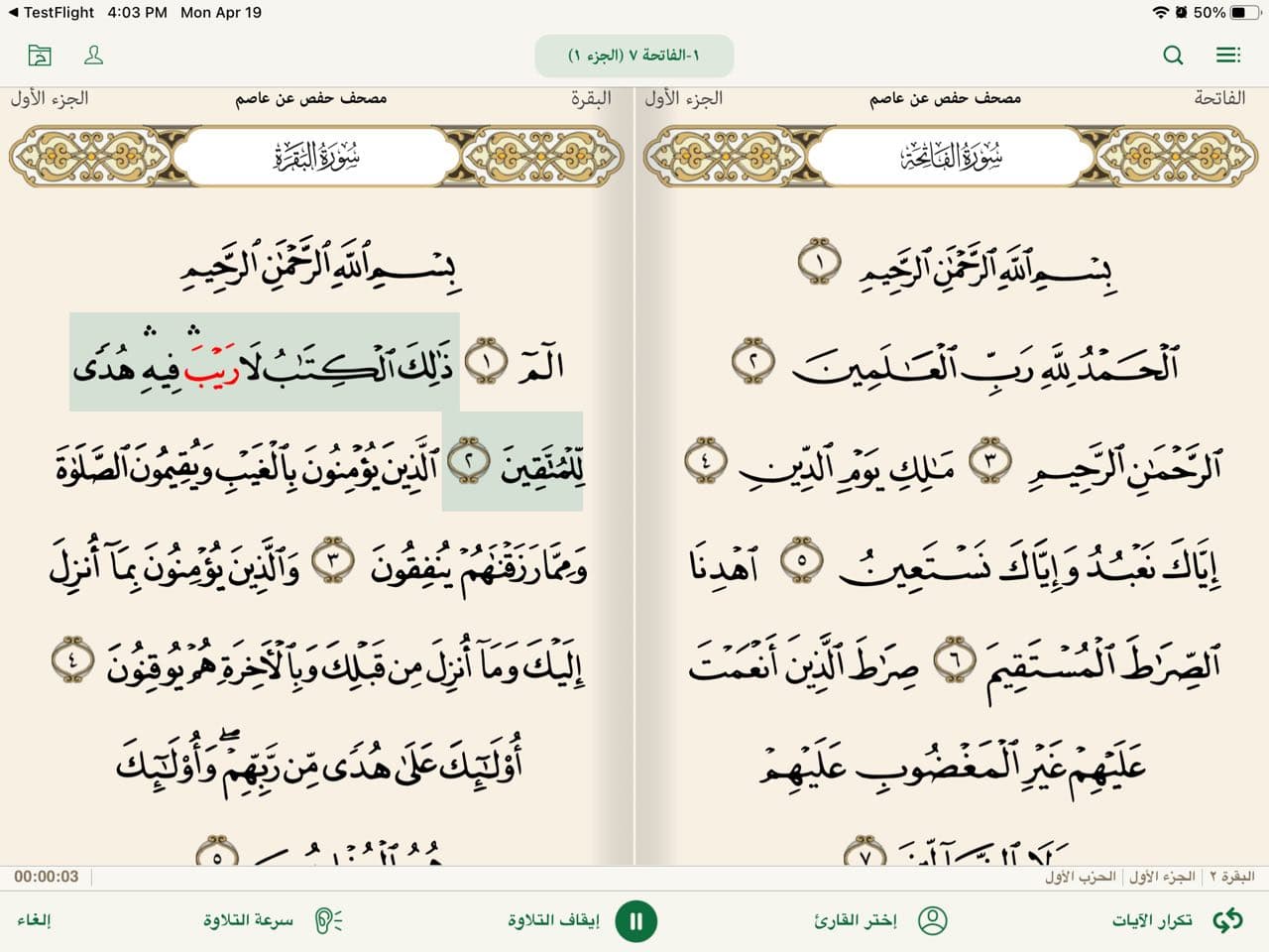 الاستماع إلى التلاوات مع خاصّيَّة تلوينِ الكلمات في المُصحف